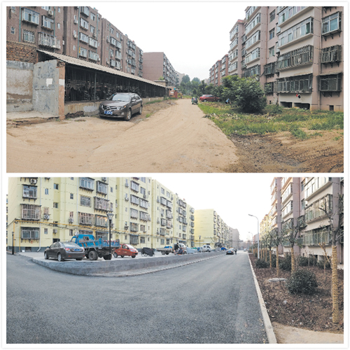 图:某小区改造前(上)与改造后(下)对比,道路硬化、绿化提升、设施完善(来源:材料图片)