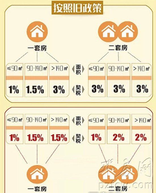 图:新旧契税政策对比,首套140㎡以上从3%降至1.5%,二套90㎡以下从3%降至1%(来源:材料图片)